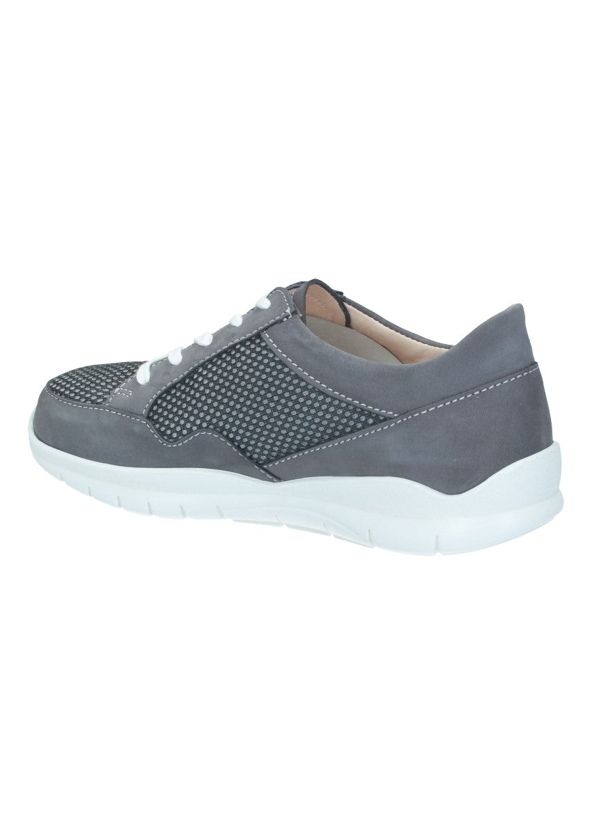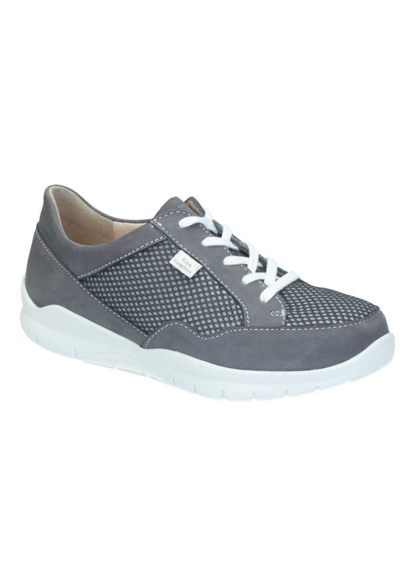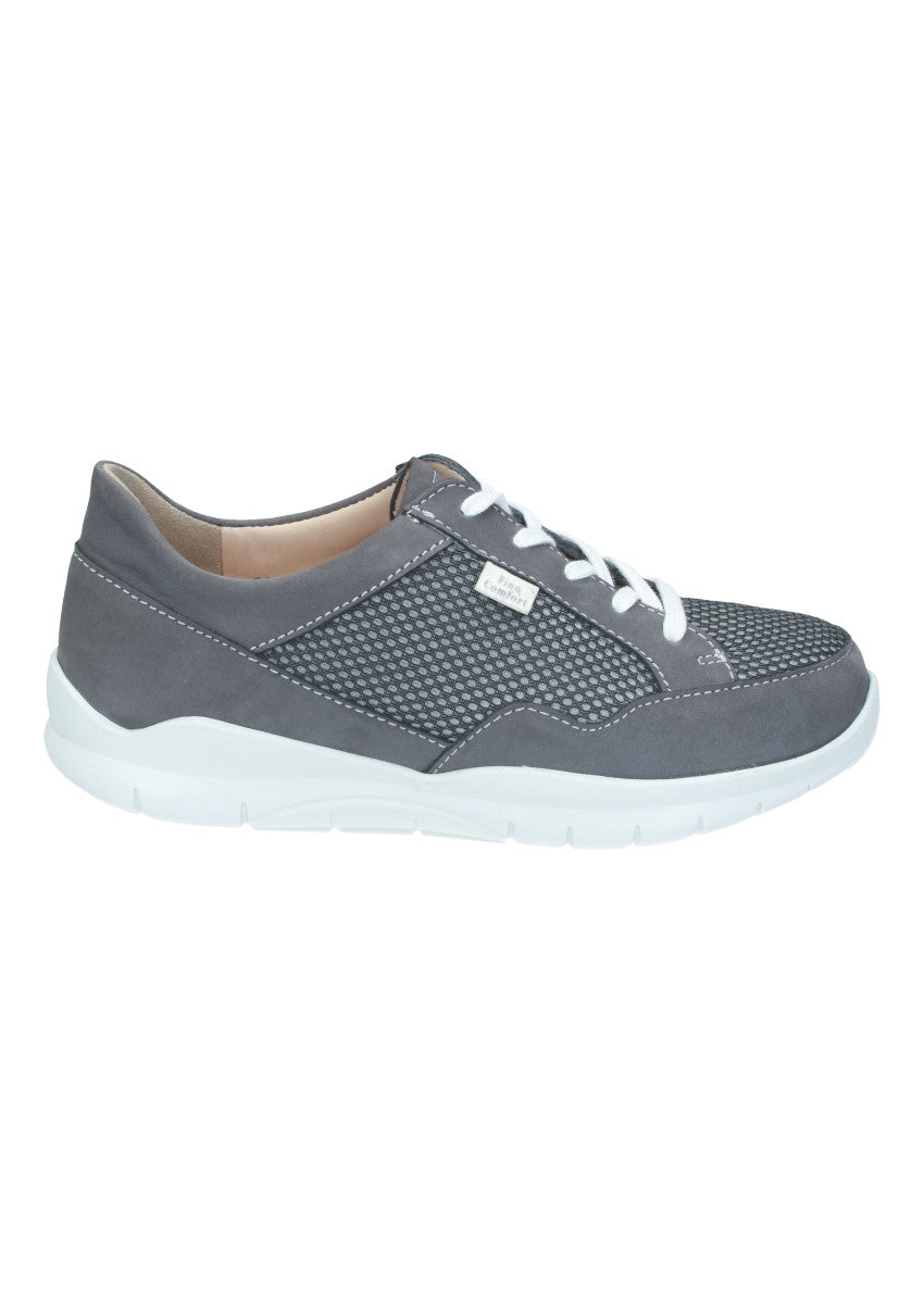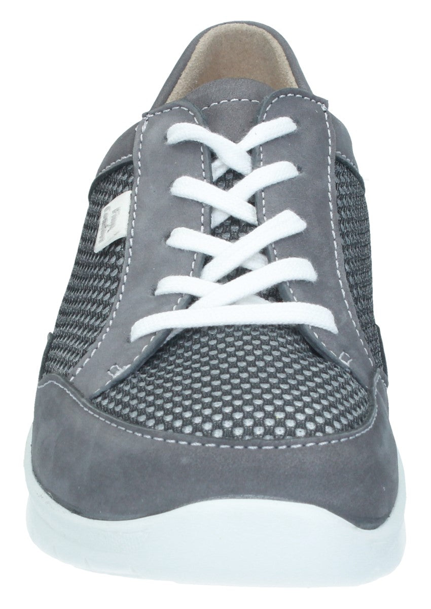 Sportlicher Finnamic-Halbschuh der durch seine Abrollsohle den natürlichen Bewegungsablauf unterstützt zugleich aber auch für Entlastung und Komfort sorgt. Die lange Schnürung am Spann sorgt für festen Halt und optimalen Sitz. Durch das wechselbare Fußbett ist er auch für lose Einlagen gut geeignet.