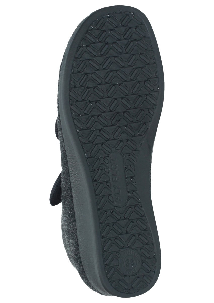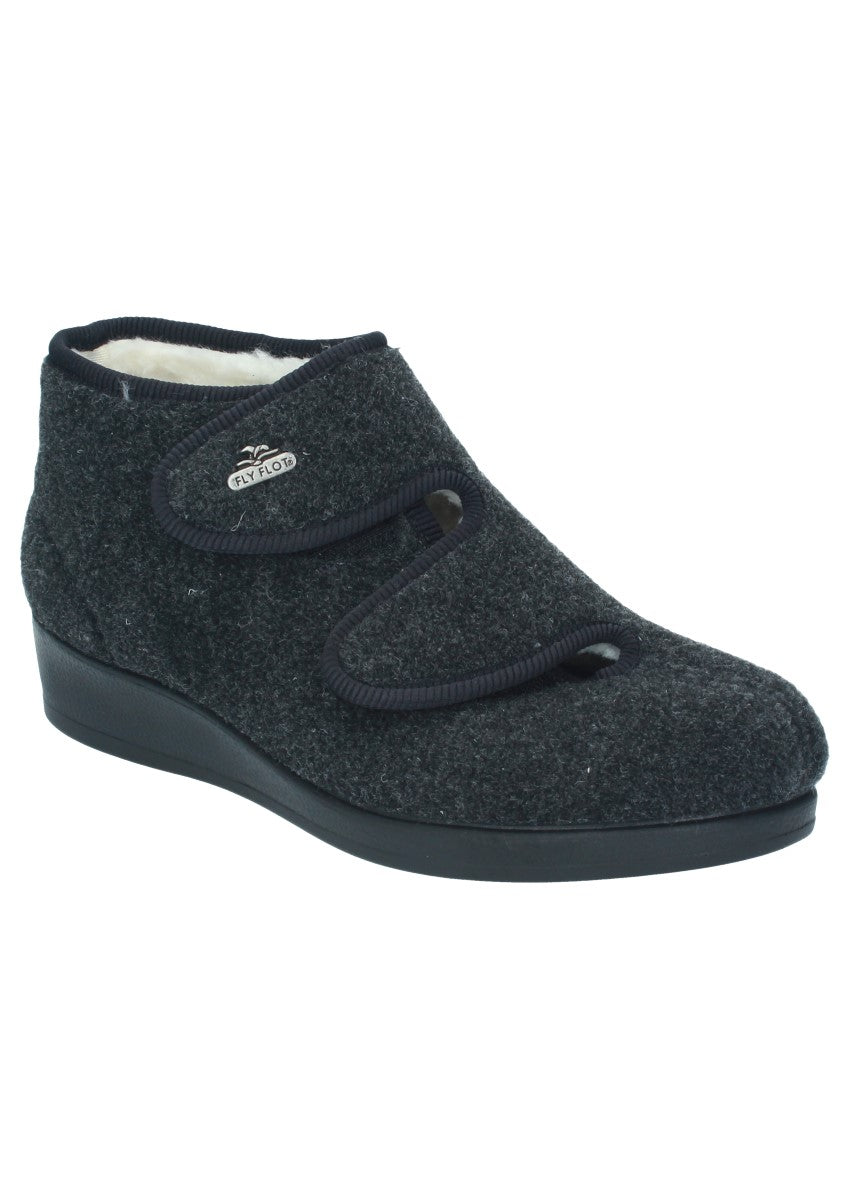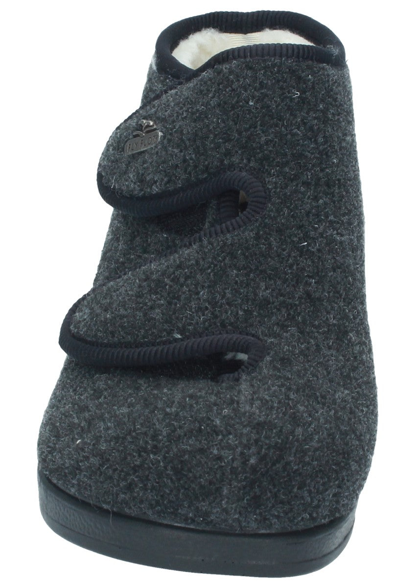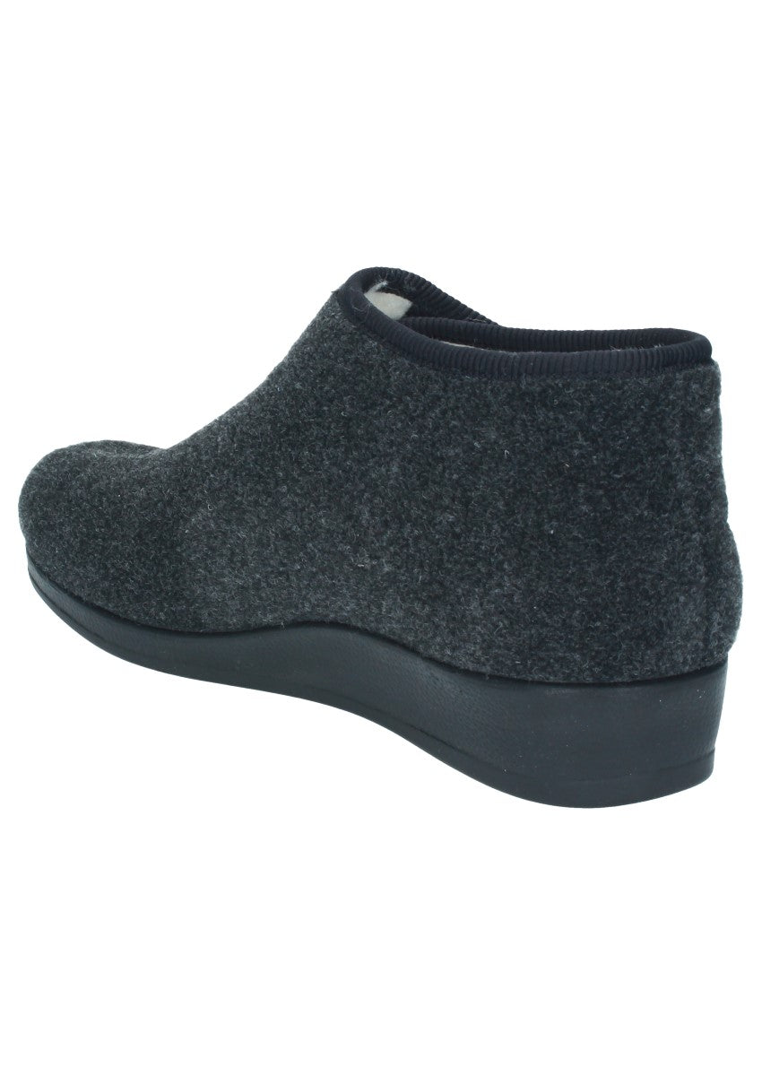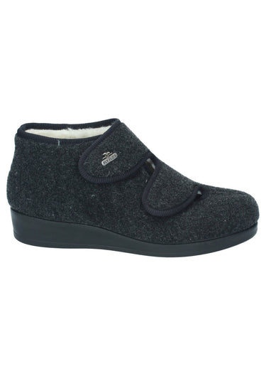 Warmer, leichter und Knöchelhoher Hausschuh mit leichtem Keilabsatz und Klettverschluss am Spann der Ihrem Fuß optimalen Halt bietet. Das wechselbare Fußbett ermöglicht Ihnen eine individuelle Einlage reinzulegen. Das ist der perfekte Begleiter für zuhause!