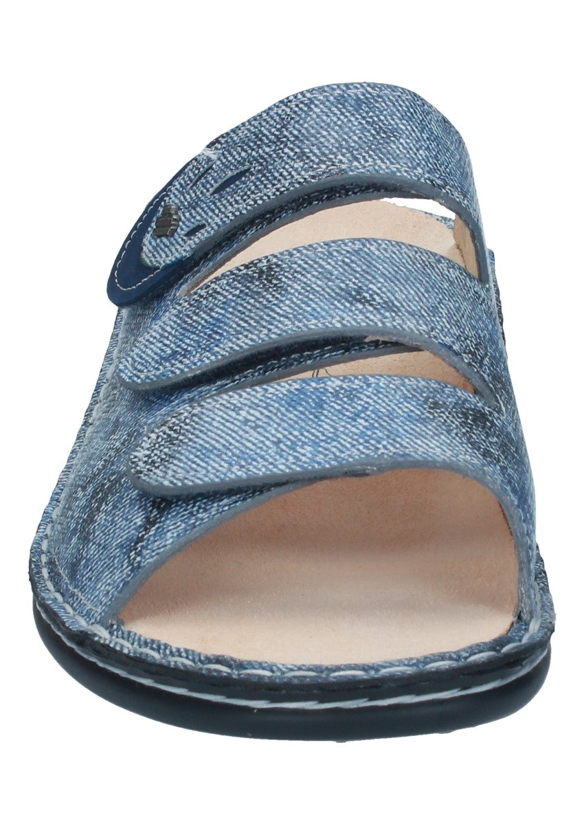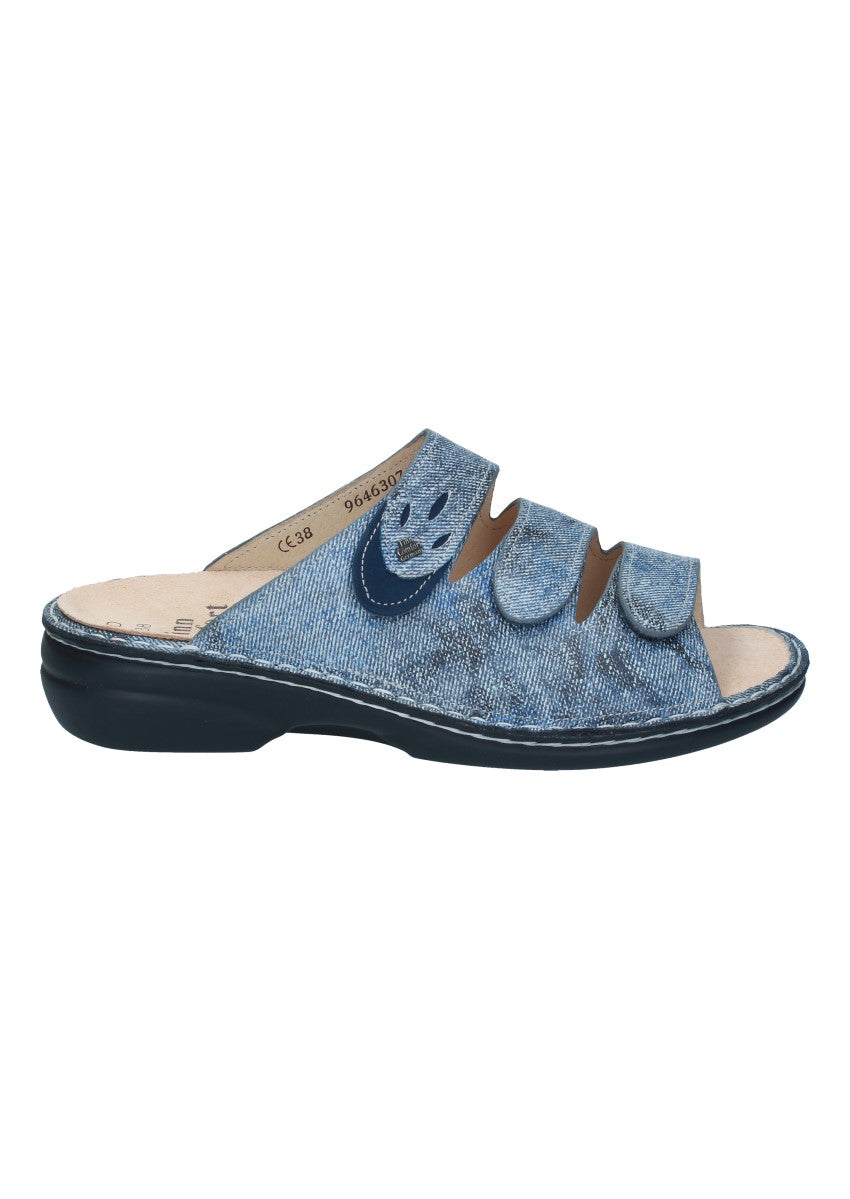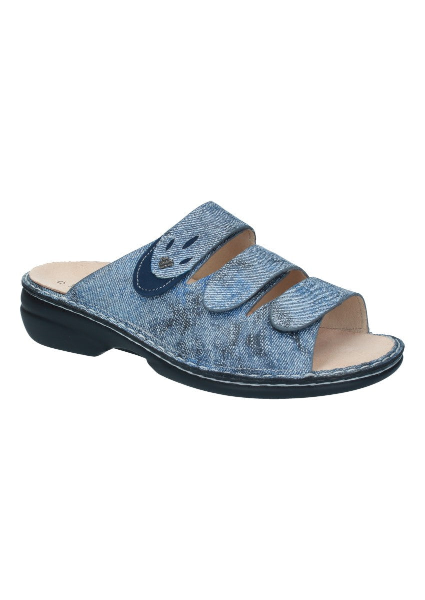 Damenpantolette mit kleinem Absatz und drei verstellbaren Klettverschlüssen die Ihrem Fuß guten Halt und optimalen Sitz bieten. Das Fußbett ist wechselbar, somit ist sie auch für Einlagenträger geeignet. Dazu verleiht die Applikation am Klett und das Muster dem Schuh das gewisse Etwas. Einfach anziehen und sich wohlfühlen!