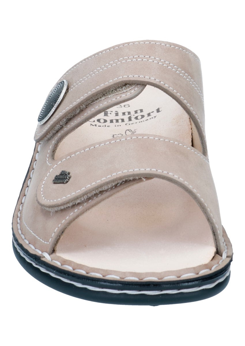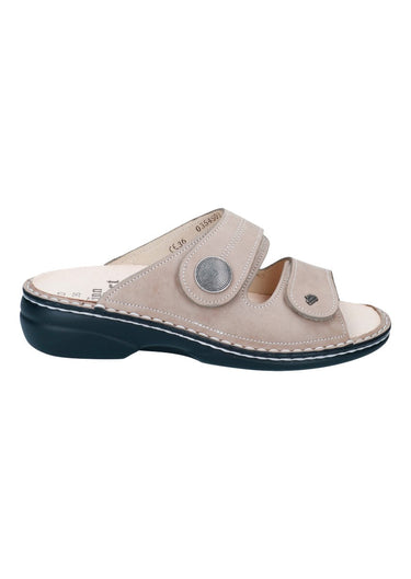 Damenpantolette mit Absatz und zwei verstellbaren Klettverschlüssen die Ihrem Fuß guten Halt und optimalen Sitz bieten. Das Fußbett ist wechselbar, somit ist sie auch für Einlagenträger geeignet. Dazu verleiht die Aplikation auf dem Schuh das gewisse Etwas.