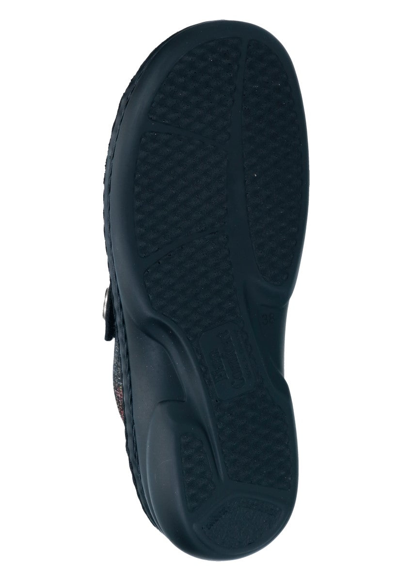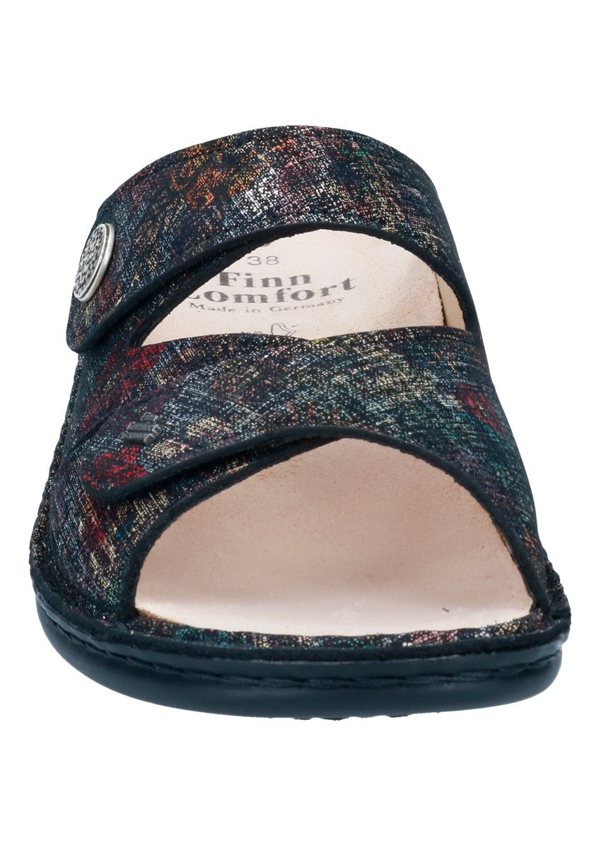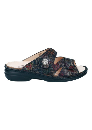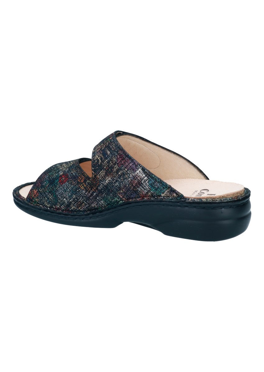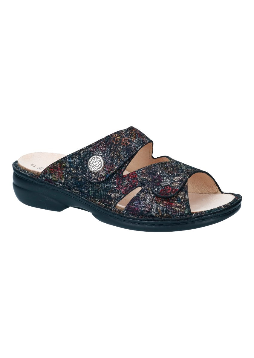 Damenpantolette mit kleinem Absatz und zweiverstellbaren Klettverschlüssen die Ihrem Fuß guten Halt und optimalen Sitz bieten.