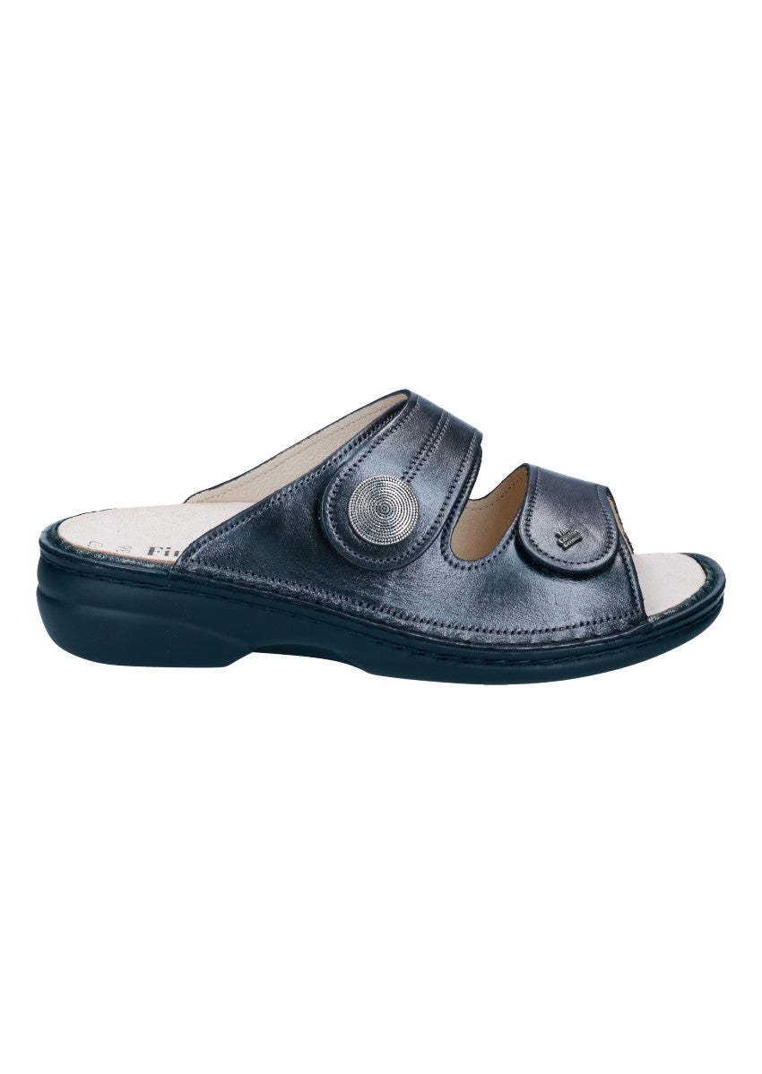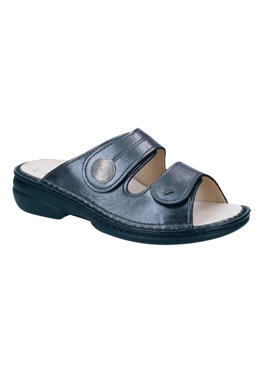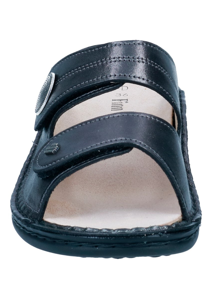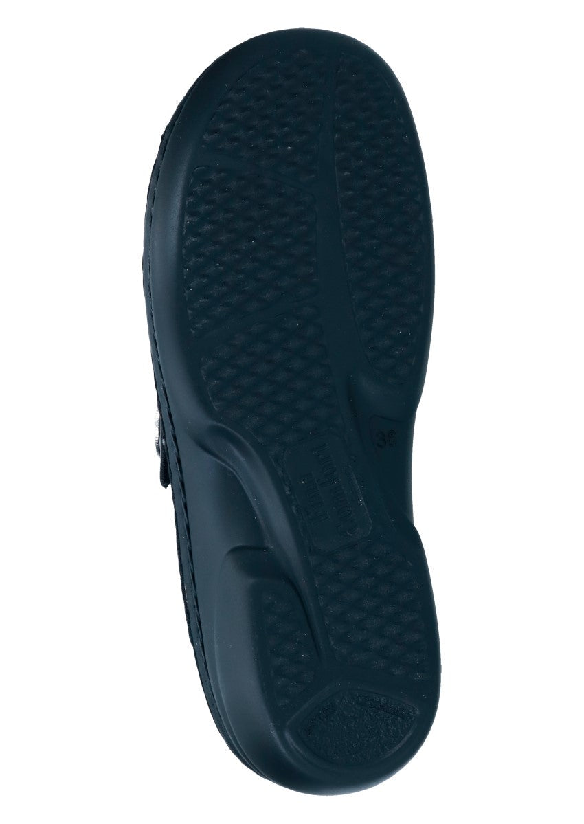 Damenpantolette mit zwei verstellbaren Klettverschlüssen die Ihrem Fuß guten Halt und optimalen Sitz bieten. Das Fußbett ist wechselbar, somit ist sie auch für Einlagenträger geeignet.