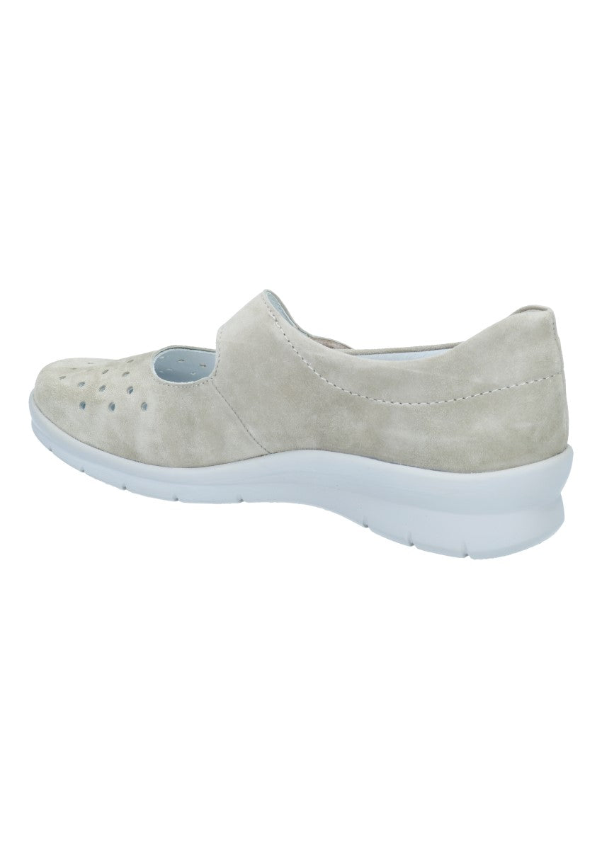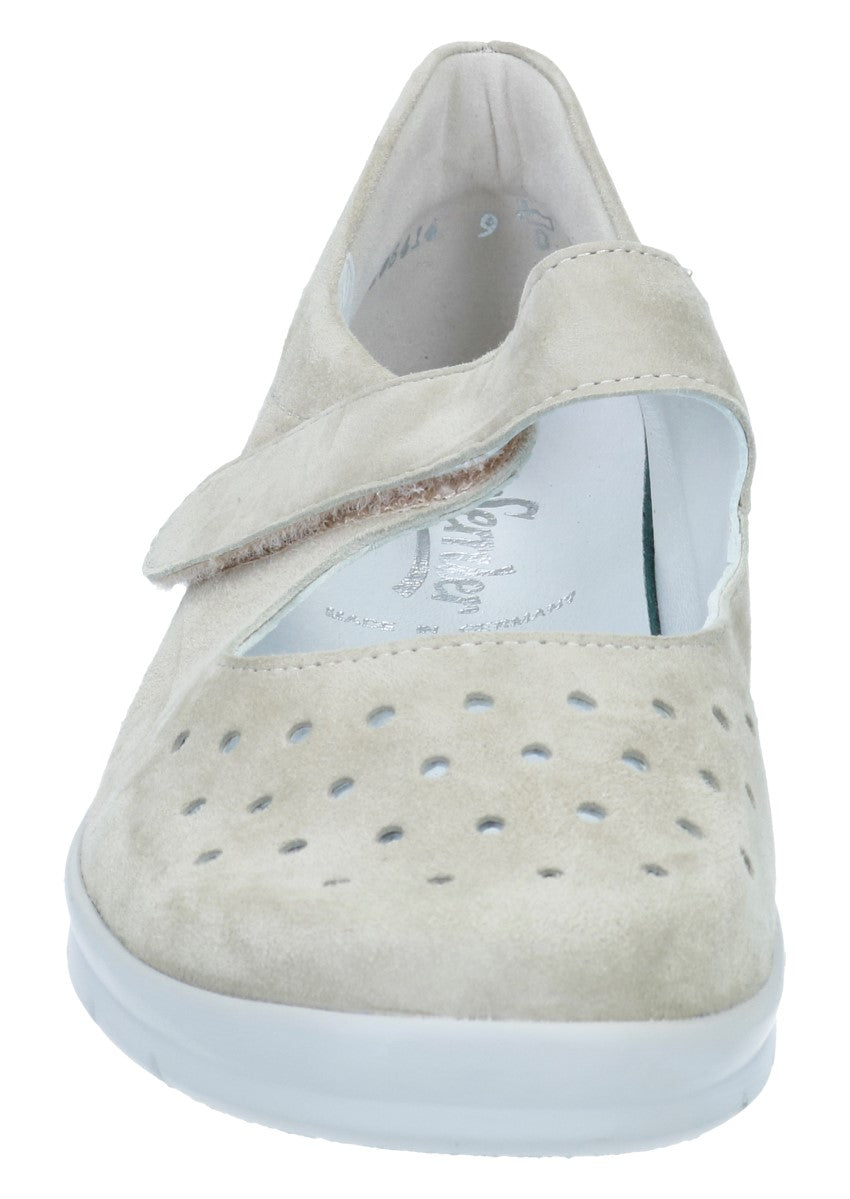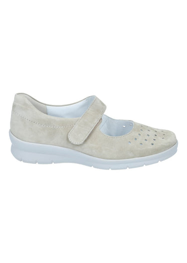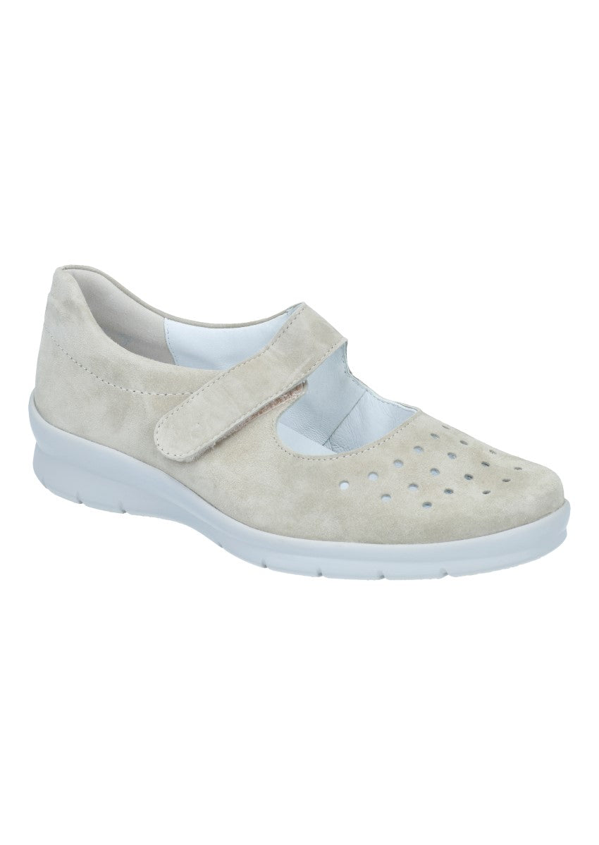 Sportlicher, luftiger Damenhalbschuh mit Klettverschluss am Spann. Durch das wechselbare Fußbett ist dieser Schuh auch gut für Einlagenträgerinnen geeignet.