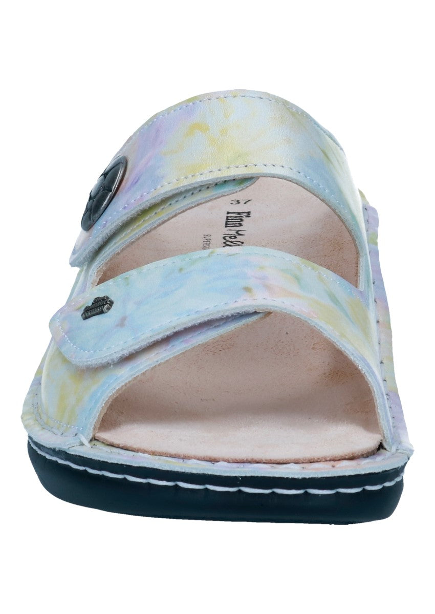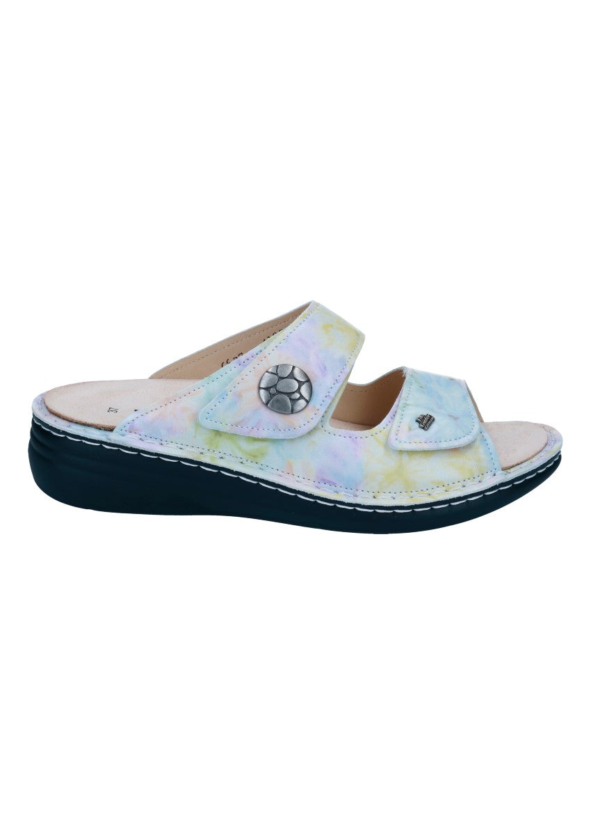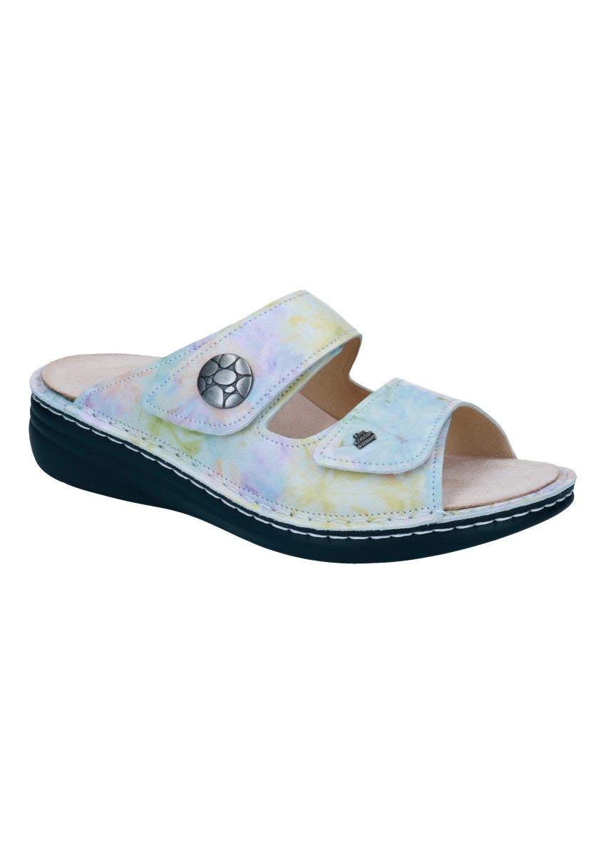 Damenpantolette mit zwei verstellbaren Klettverschlüssen die Ihrem Fuß guten Halt und optimalen Sitz bieten. Das Fußbett ist wechselbar, somit ist sie auch für Einlagenträger geeignet.