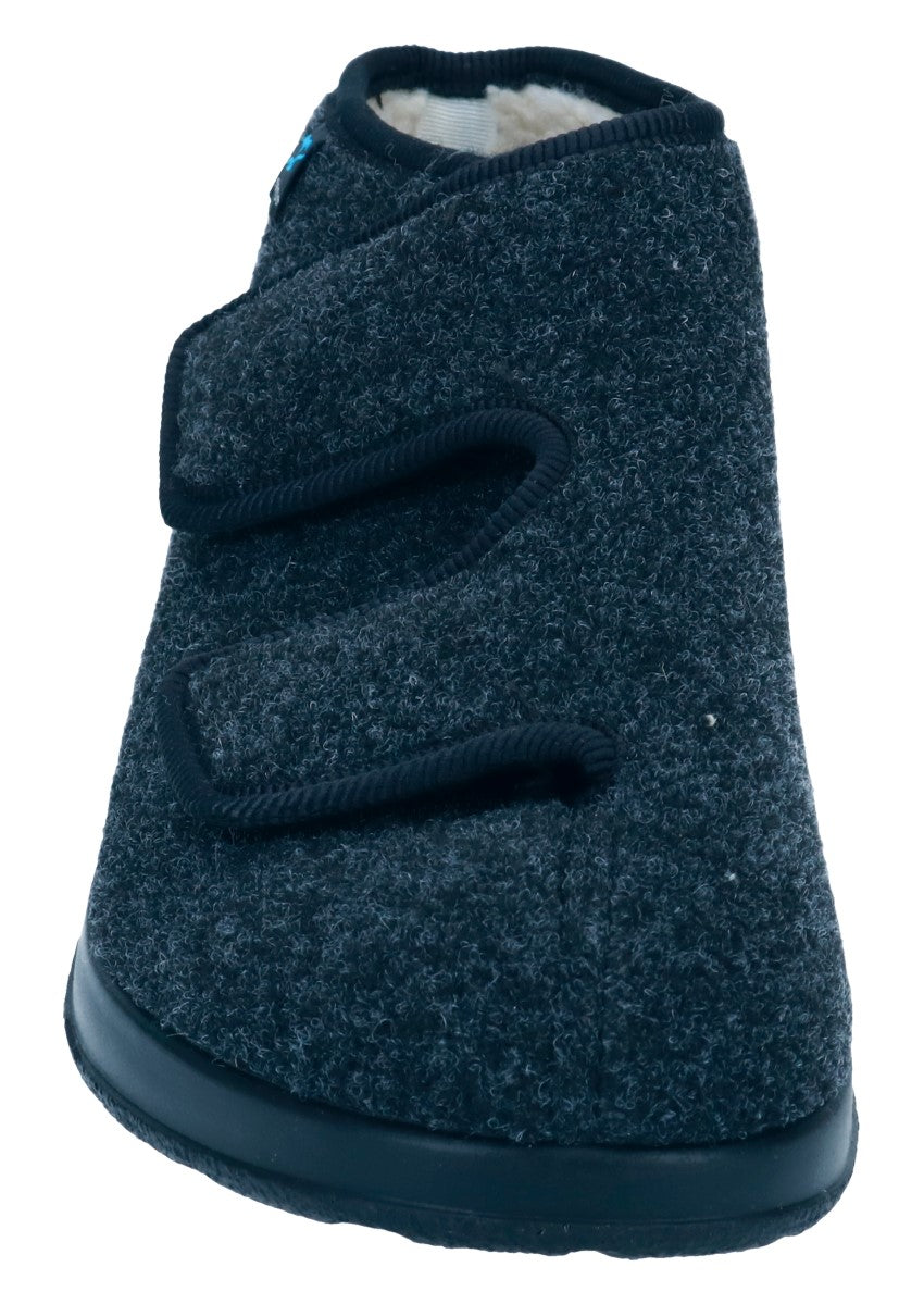 Warmer, leichter und Knöchelhoher Hausschuh mit leichtem Keilabsatz und Klettverschluss am Spann der Ihrem Fuß optimalen Halt bietet.