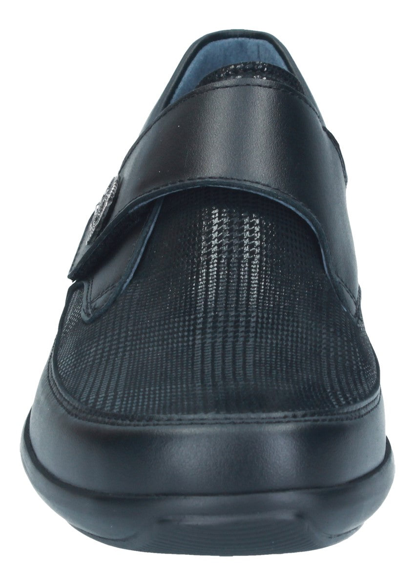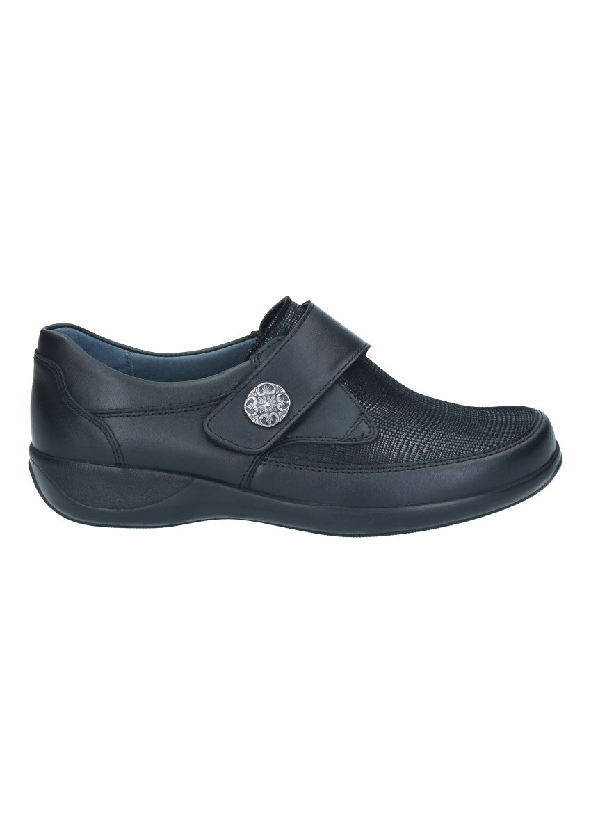 Schicker Pantolette mit Klettverschluss am Spann. Durch das wechselbare Fußbett ist dieser Schuh auch gut für Einlagenträgerinnen geeignet.