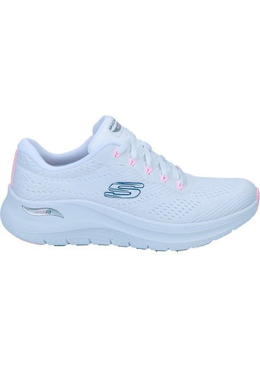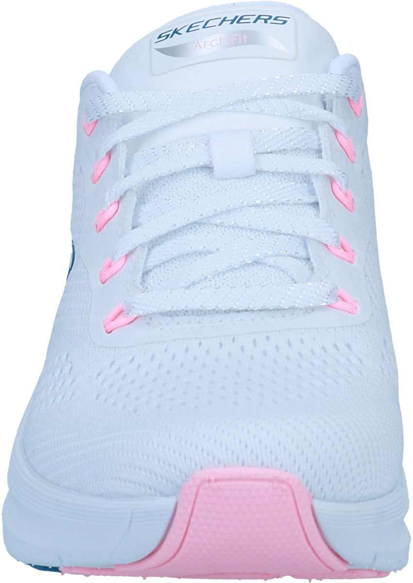 Der Skechers Arch Fit 2.0 Big League kombiniert modernes Design mit maximalem Komfort. In der frischen Farbkombination Weiß mit Pink und Blau wird dieser Sneaker zum sportlich-femininen Hingucker. Dank des herausnehmbaren Arch Fit-Fußbetts bietet er optimale Unterstützung - ideal für lange Tage auf den Beinen.