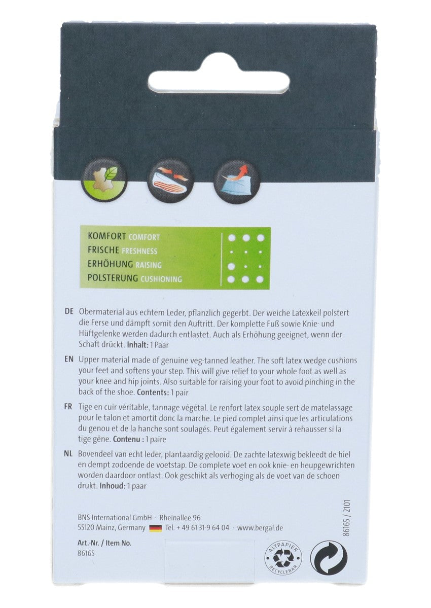 Obermaterial aus echtem Leder, pfl anzlich gegerbt. Der weiche Latexkeil polstert die Ferse und dämpft somit den Auftritt. Der komplette Fuß sowie Knie- und Hüftgelenke werden dadurch entlastet. Auch als Erhöhung geeignet, wenn der Schaft drückt.