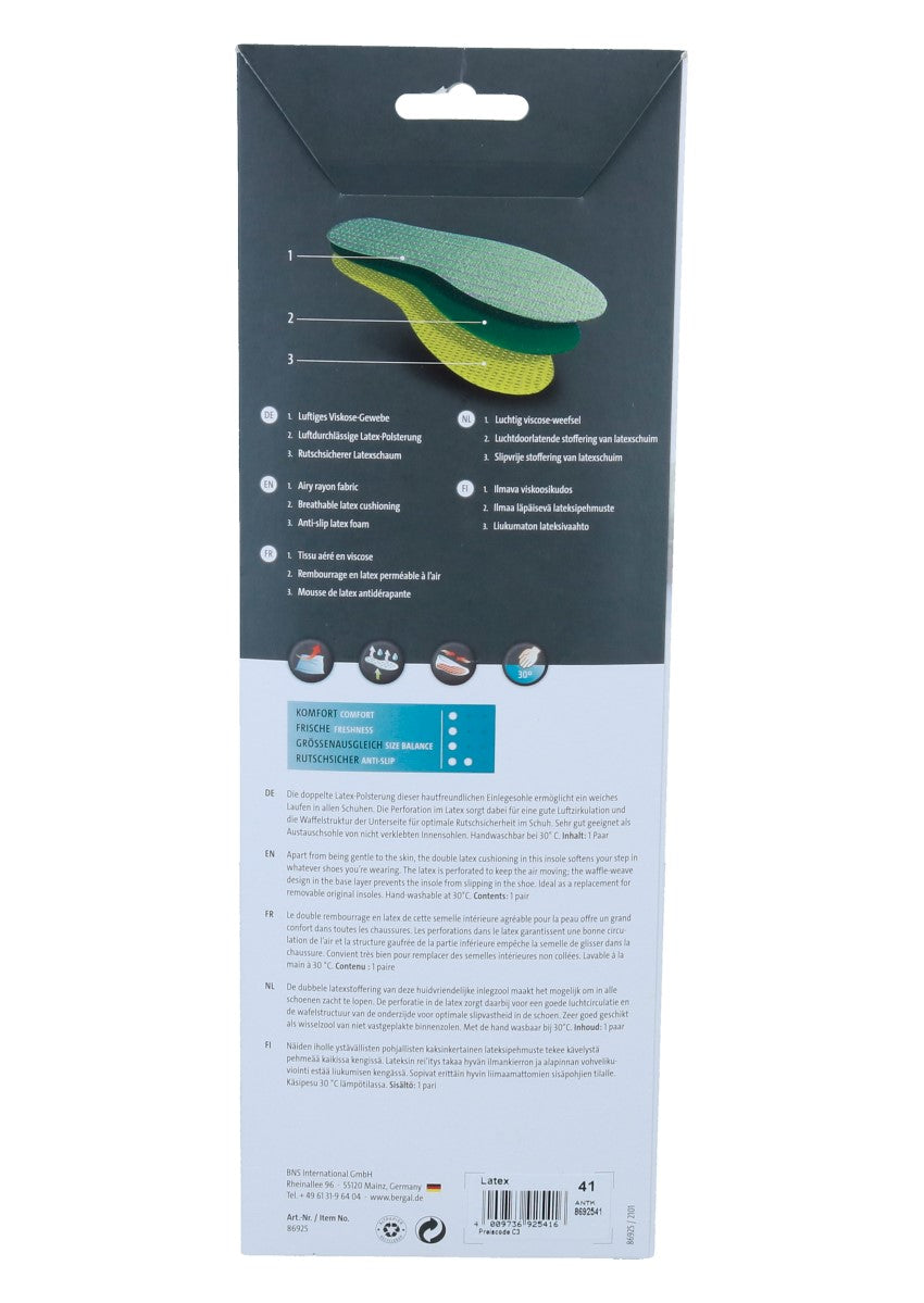 Die Einlegesohle ermöglicht Ihnen ein superweiches Laufen in Ihren Schuhen. Die Perforation im Latex sorgt dabei für eine gute Luftzirkulation.