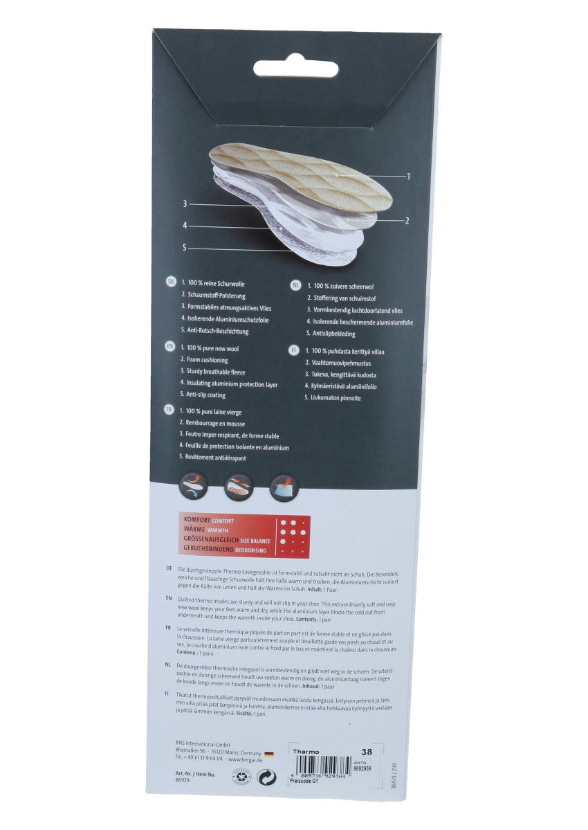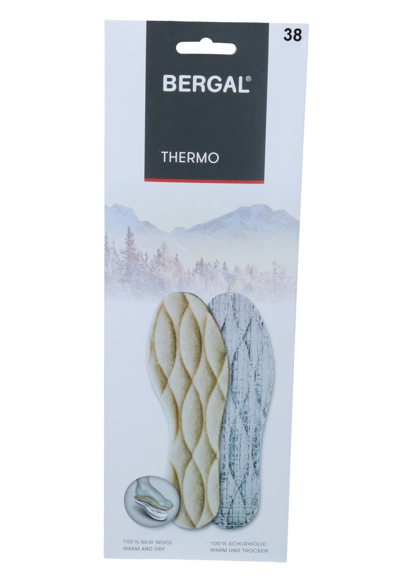 Die durchgesteppte BERGAL-Thermo-Einlegesohle ist formstabil und rutscht nicht im Schuh. Die besonders weiche und flauschige Schurwolle hält Ihre Füße warm und trocken, die Aluminiumschicht isoliert gegen die Kälte von unten und hält die Wärme im Schuh.