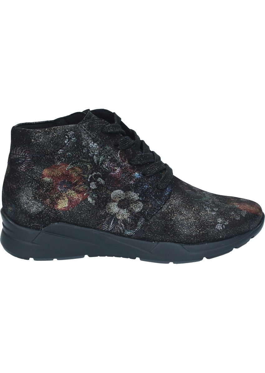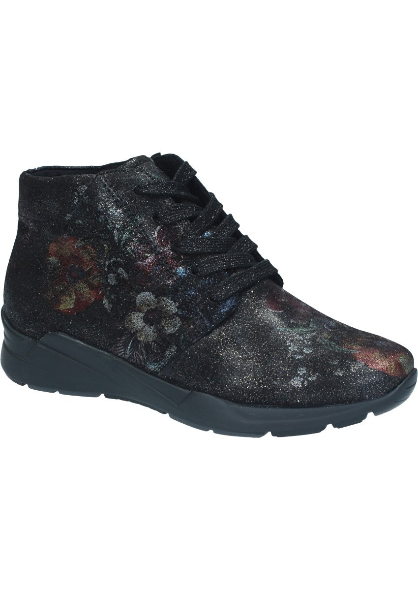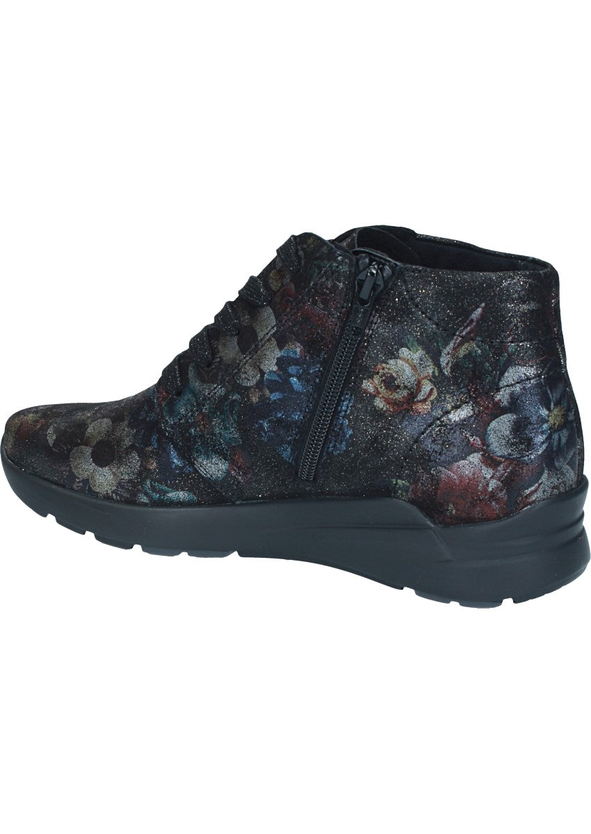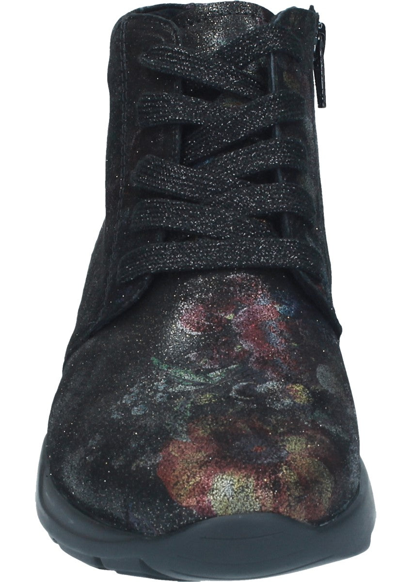Elegante Stiefelette in Blumen-Optik mit angenehmer Luftpolstersohle. Durch die Schnürung am Spann lässt sich der Schuh optimal anpassen, außerdem sorgt der Reissverschluss an der Innenseite für einen guten Halt.