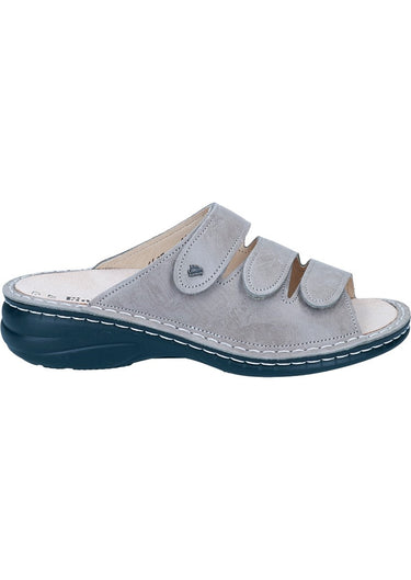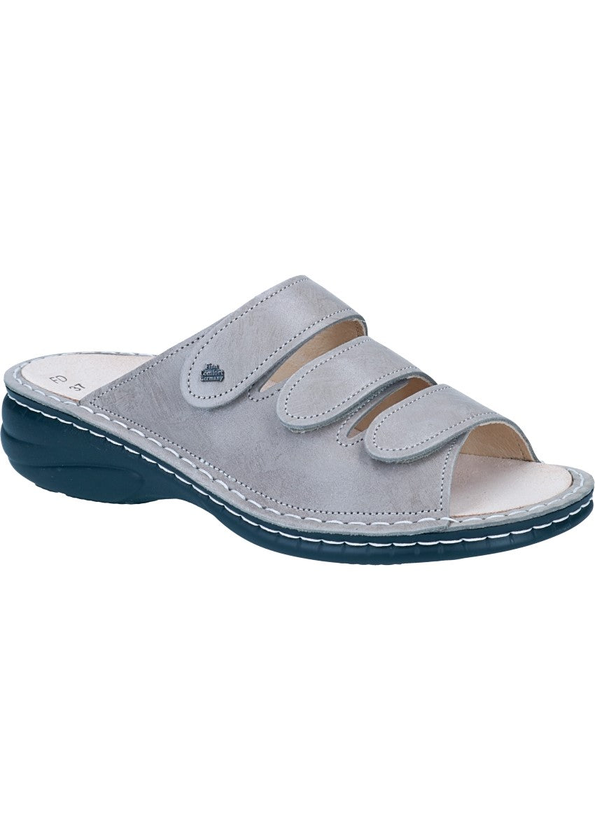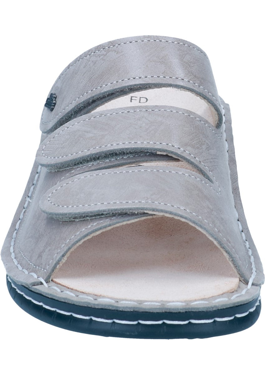 Das Modell Hellas von FinnComfort ist eine bequeme Damen-Pantolette in der Form Classic mit drei verstellbaren Klettverschlüssen für optimale Fußanpassung. Sie ist für kräftige, breite Füße konzipiert und hat eine Naturform. Das auswechselbare Fußbett ermöglicht individuelle Anpassungen und das Tragen orthopädischer Einlagen. Hellas erfüllt die hohen Qualitätsstandards von FinnComfort.