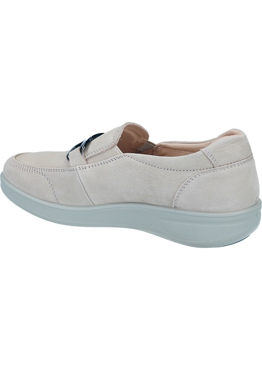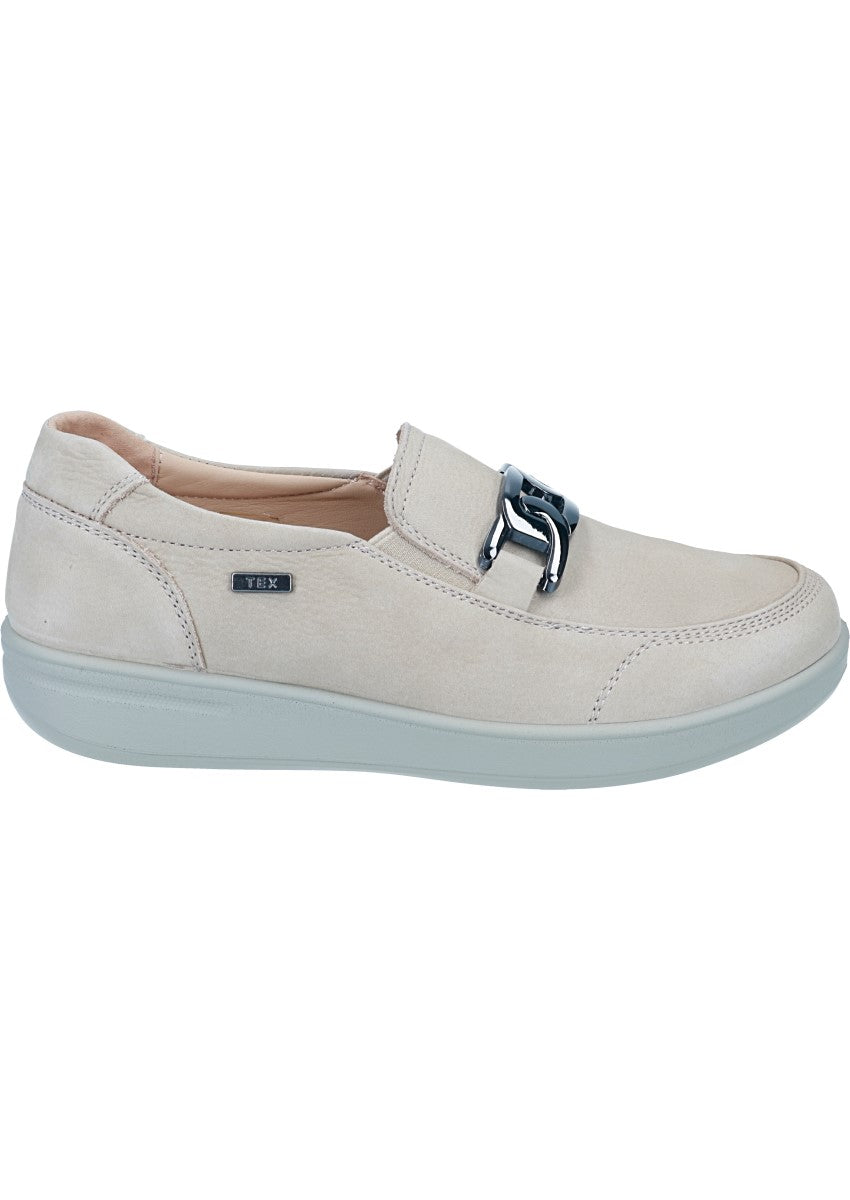 Schöner Komfort Mokassin Slipper für Damen mit glänzender Gliederkette verziert.. Das Innenmaterial und die herausnehmbare, weich gepolsterte Decksohle bestehen aus echt Glattleder. Die leichte und dämpfende Laufsohle. Zwei eingenähte Gummizüge am Spann ermöglichen ein leichtes reinschlupfen.